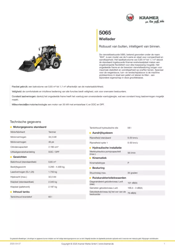 De vierwielbestuurde 5065, bekend geworden onder de naam “650”, is een model van de 5-serie en staat voor compactheid en wendbaarheid. Het laadbakvolume van 0,65 m³ tot 1,1 m³ alsook de standaard ingebouwde Kramer-snelwisselplaat maken een ongeëvenaarde flexibiliteit voor elke toepassing mogelijk. Het ongedeelde frame en de bewezen vierwielbesturing zorgen voor maximale stabiliteit en wendbaarheid op oneffen terrein. Speciaal voor de wegenbouw, tuin- en landschapsbouw is de machine probleemloos in staat een pallet vol stenen te tillen - een bijzondere eigenschap in deze grootteklasse.