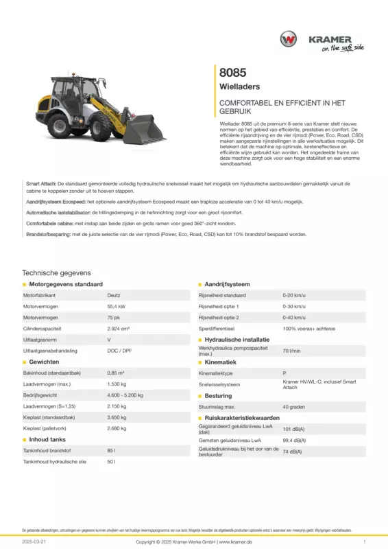 Wiellader 8085 uit de premium 8-serie van Kramer stelt nieuwe normen op het gebied van efficiëntie, prestaties en comfort. De efficiënte rijaandrijving en de vier rijmodi (Power, Eco, Road, CSD) maken aangepaste rijinstellingen in alle werksituaties mogelijk. Dit betekent dat de machine op optimale, kosteneffectieve en efficiënte wijze gebruikt kan worden. Het ongedeelde frame van deze machine zorgt ook voor een hoge stabiliteit en een enorme wendbaarheid.