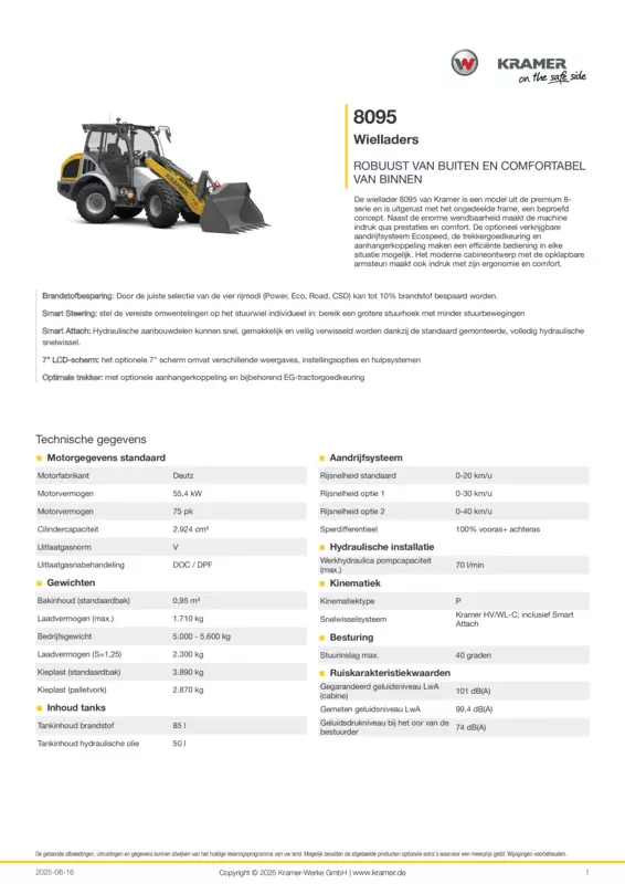 De wiellader 8095 van Kramer is een model uit de premium 8-serie en is uitgerust met het ongedeelde frame, een beproefd concept. Naast de enorme wendbaarheid maakt de machine indruk qua prestaties en comfort. De optioneel verkrijgbare aandrijfsysteem Ecospeed, de trekkergoedkeuring en aanhangerkoppeling maken een efficiënte bediening in elke situatie mogelijk. Het moderne cabineontwerp met de opklapbare armsteun maakt ook indruk met zijn ergonomie en comfort.