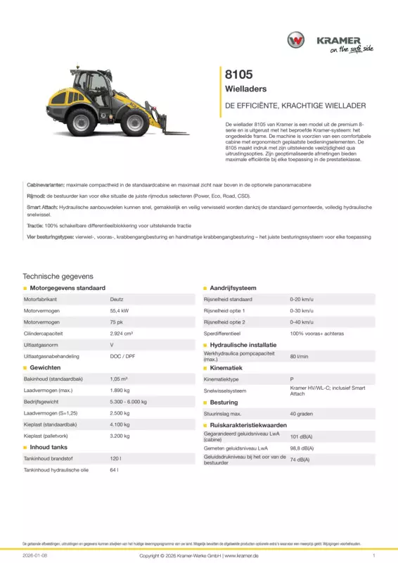 De wiellader 8105 van Kramer is een model uit de premium 8-serie en is uitgerust met het beproefde Kramer-systeem: het ongedeelde frame. De machine is voorzien van een comfortabele cabine met ergonomisch geplaatste bedieningselementen. De 8105 maakt indruk met zijn uitstekende veelzijdigheid qua uitrustingsopties. Zijn geoptimaliseerde afmetingen bieden maximale efficiëntie bij elke toepassing in de prestatieklasse.