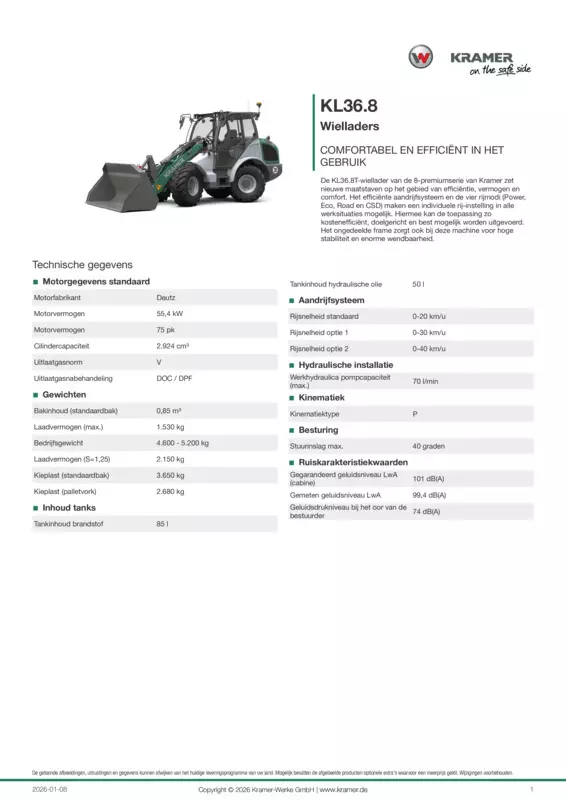 De KL36.8T-wiellader van de 8-premiumserie van Kramer zet nieuwe maatstaven op het gebied van efficiëntie, vermogen en comfort. Het efficiënte aandrijfsysteem en de vier rijmodi (Power, Eco, Road en CSD) maken een individuele rij-instelling in alle werksituaties mogelijk. Hiermee kan de toepassing zo kostenefficiënt, doelgericht en best mogelijk worden uitgevoerd. Het ongedeelde frame zorgt ook bij deze machine voor hoge stabiliteit en enorme wendbaarheid.