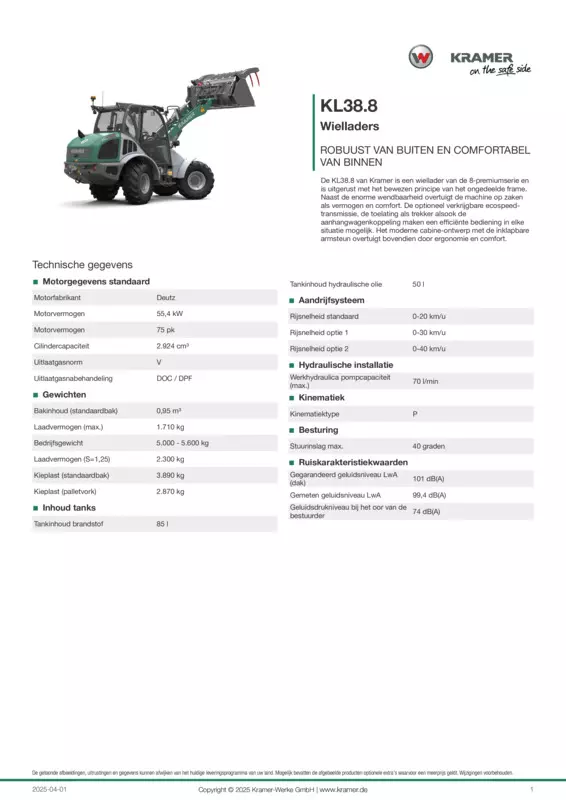 De KL38.8 van Kramer is een wiellader van de 8-premiumserie en is uitgerust met het bewezen principe van het ongedeelde frame. Naast de enorme wendbaarheid overtuigt de machine op zaken als vermogen en comfort. De optioneel verkrijgbare ecospeed-transmissie, de toelating als trekker alsook de aanhangwagenkoppeling maken een efficiënte bediening in elke situatie mogelijk. Het moderne cabine-ontwerp met de inklapbare armsteun overtuigt bovendien door ergonomie en comfort.