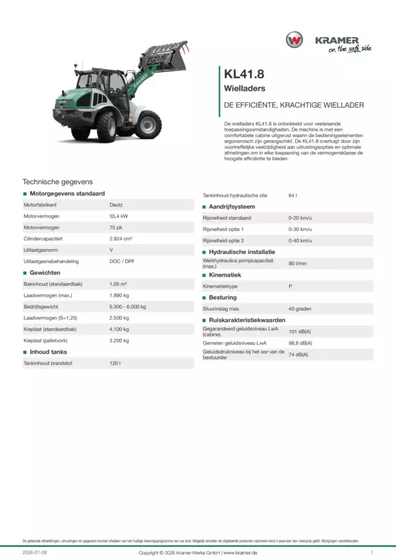 De wielladers KL41.8 is ontwikkeld voor veeleisende toepassingsomstandigheden. De machine is met een comfortabele cabine uitgerust waarin de bedieningselementen ergonomisch zijn gerangschikt. De KL41.8 overtuigt door zijn voortreffelijke veelzijdigheid aan uitrustingsopties en optimale afmetingen om in elke toepassing van de vermogensklasse de hoogste efficiëntie te bieden.