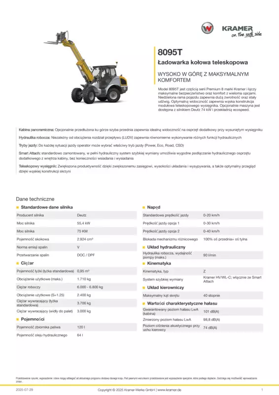 Model 8095T jest częścią serii Premium 8 marki Kramer i łączy maksymalne bezpieczeństwo oraz komfort z wieloma opcjami. Niedzielona rama pojazdu zapewnia dużą zwrotność oraz stały udźwig. Optymalną widoczność zapewnia wąska konstrukcja modułowa teleskopowego wysięgnika. Opcjonalnie maszyna jest dostępna z silnikiem Deutz 74 kW i przekładnią ecospeed.