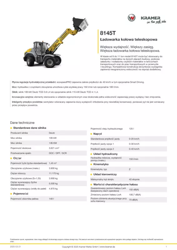 W klasie od 9 do 11 ton model 8145T może być stosowany do transportu materiałów na dużych placach budowy, podczas załadunku i rozładunku ciężkich materiałów w łańcuchach transportowych oraz do prac transportowych w przemyśle i recyklingu. Kompaktowa konstrukcja skrzynkowa wysięgnika zapewnia nieograniczoną widoczność na osprzęt dodatkowy.