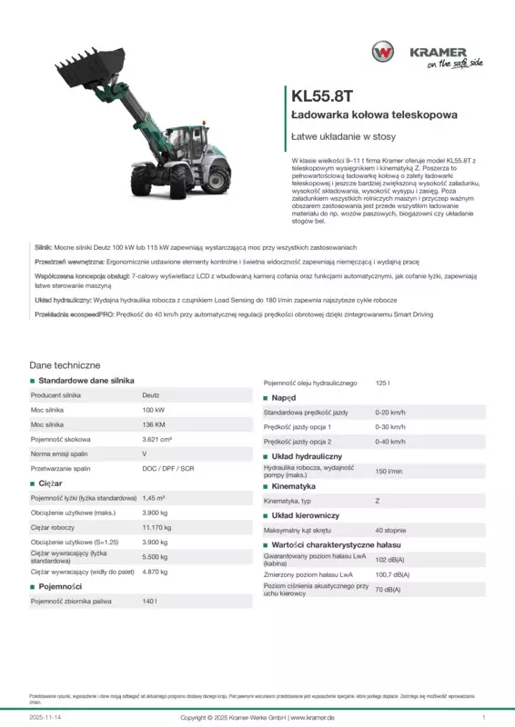 W klasie wielkości 9–11 t firma Kramer oferuje model KL55.8T z teleskopowym wysięgnikiem i kinematyką Z. Poszerza to pełnowartościową ładowarkę kołową o zalety ładowarki teleskopowej i jeszcze bardziej zwiększoną wysokość załadunku, wysokość składowania, wysokość wysypu i zasięg. Poza załadunkiem wszystkich rolniczych maszyn i przyczep ważnym obszarem zastosowania jest przede wszystkim ładowanie materiału do np. wozów paszowych, biogazowni czy układanie stogów bel.