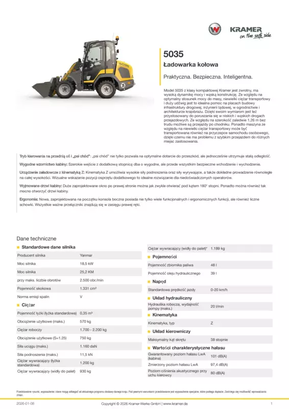 Model 5035 z klasy kompaktowej Kramer jest zwrotny, ma wysoką dynamikę mocy i wąską konstrukcję. Ze względu na optymalny stosunek mocy do masy, niewielki ciężar transportowy i duży udźwig jest to idealna pomoc na placach budowy infrastruktury drogowej, inżynierii lądowej, w ogrodnictwie i architekturze krajobrazu. Dzięki swoim wymiarom jest też przystosowany do poruszania się w niskich i wąskich drogach przejazdowych. Ze względu na szerokość zaledwie 1,26 m bez trudu możliwe są przejazdy po chodniku. Ponadto maszyna ze względu na niewielki ciężar transportowy może być transportowana również na przyczepce samochodu osobowego, dzięki czemu nie ma problemu z szybkim przejazdem do różnych miejsc zastosowania.