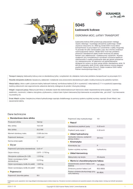 Ładowarka kołowa 5045 przekonuje połączeniem niskiego ciężaru własnego i wysokiego obciążenia użytkowego. Dzięki ciężarowi roboczemu ok. 2600 kg model 5045 można łatwo transportować na przyczepie 3,5 t (zwolnienie z opłaty drogowej). To pozwala nie tylko zaoszczędzić czas, lecz również zwiększyć wykorzystywanie maszyn. Model 5045 może bez problemu przewozić standardowe palety kostki brukowej lub pakiety kamieni oraz załadowywać i rozładowywać ciężarówki. Wysoka wydajność przy kompaktowych wymiarach rozszerza spektrum zastosowania o wąskie przestrzenie takie jak garaże podziemne czy wielopoziomowe. W zależności od zapotrzebowania dostępne do wyboru są dwie wersje silnika: standardowy silnik 19 kW lub opcjonalny silnik 33 kW, dzięki któremu można osiągnąć prędkość maksymalnie 30 km/h. Dzięki modelowi 5045 marka Kramer rewolucjonizuje klasę 2,8 t.
