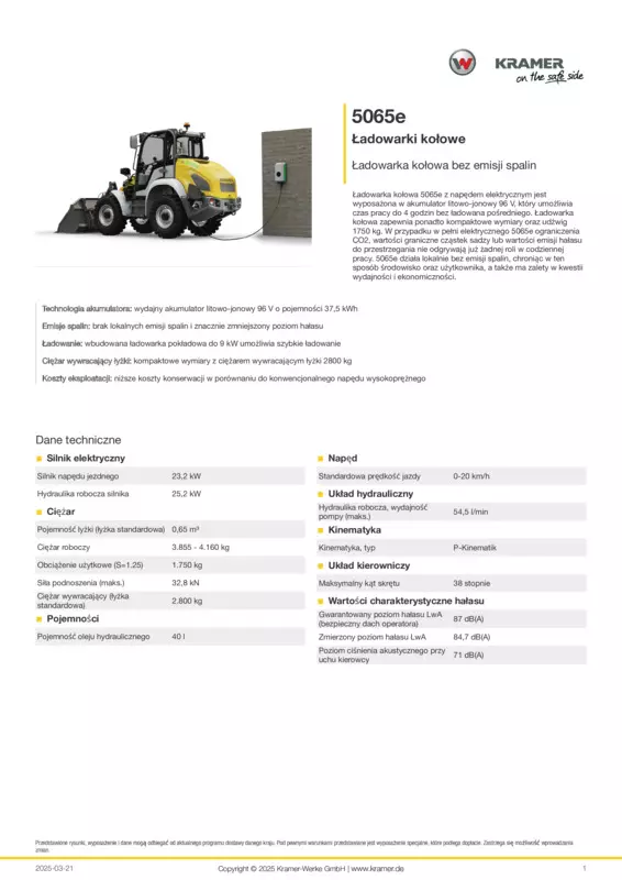 Ładowarka kołowa 5065e z napędem elektrycznym jest wyposażona w akumulator litowo-jonowy 96 V, który umożliwia czas pracy do 4 godzin bez ładowana pośredniego. Ładowarka kołowa zapewnia ponadto kompaktowe wymiary oraz udźwig 1750 kg. W przypadku w pełni elektrycznego 5065e ograniczenia CO2, wartości graniczne cząstek sadzy lub wartości emisji hałasu do przestrzegania nie odgrywają już żadnej roli w codziennej pracy. 5065e działa lokalnie bez emisji spalin, chroniąc w ten sposób środowisko oraz użytkownika, a także ma zalety w kwestii wydajności i ekonomiczności.