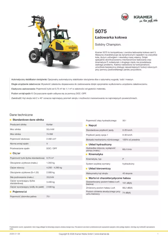 Kramer 5075 to kompaktowa i zwrotna ładowarka kołowa serii 5. Maszyna charakteryzuje się dynamicznym napędem na wszystkie koła, dużym udźwigiem i niewielką masą własną. Dzięki specjalnie skontruowanemu mechanizmowi ładowania oraz kinematyce P, rozładunek z drugiego rzędu nie przedstawia żadnego problemu. Kabina nastawiona na funkcjonalność, umożliwia bezpieczną obsługę najważniejszych funkcji roboczych przy pomocy podświetlanego panelu przycisków.