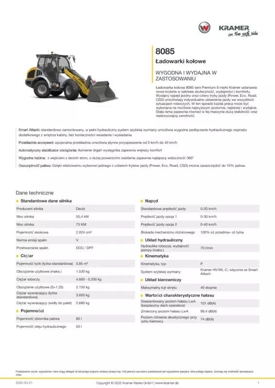 Ładowarka kołowa 8085 serii Premium 8 marki Kramer ustanawia nowe kryteria w zakresie skuteczność, wydajności i komfortu. Wydajny napęd jezdny oraz cztery tryby jazdy (Power, Eco, Road, CSD) umożliwiają indywidualne ustawienia jazdy we wszystkich sytuacjach roboczych. W ten sposób każda praca może być wykonana na możliwie najwyższym poziomie, najtaniej i wydajnie. Stała rama zapewnia również w tej maszynie dużą stabilność oraz nadzwyczajną zwrotność.