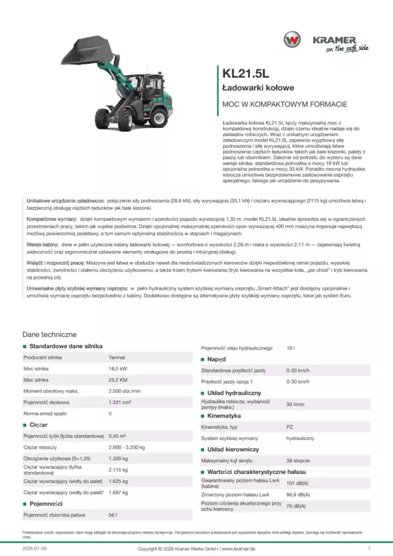 Ładowarka kołowa KL21.5L łączy maksymalną moc z kompaktową konstrukcją, dzięki czemu idealnie nadaje się do zakładów rolniczych. Wraz z unikalnym urządzeniem załadowczym model KL21.5L zapewnia wyjątkową siłę podnoszenia i siłę wyrywającą, które umożliwiają łatwe podnoszenie ciężkich ładunków takich jak bale kiszonki, palety z paszą lub obornikiem. Zależnie od potrzeb, do wyboru są dwie wersje silnika: standardowa jednostka o mocy 19 kW lub opcjonalna jednostka o mocy 33 kW. Ponadto mocna hydraulika robocza umożliwia bezproblemowe zastosowanie osprzętu specjalnego, takiego jak urządzenie do posypywania.