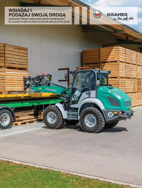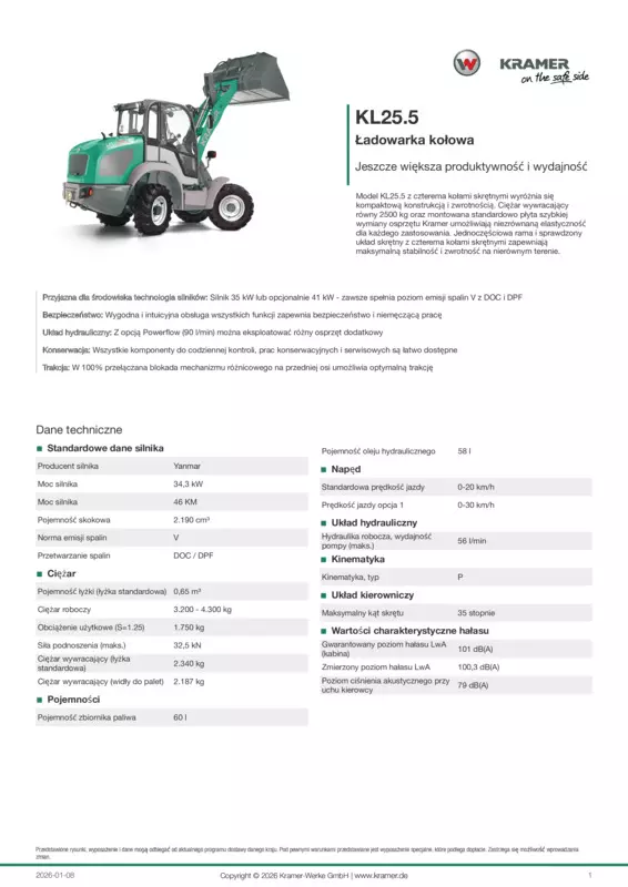 Model KL25.5 z czterema kołami skrętnymi wyróżnia się kompaktową konstrukcją i zwrotnością. Ciężar wywracający równy 2500 kg oraz montowana standardowo płyta szybkiej wymiany osprzętu Kramer umożliwiają niezrównaną elastyczność dla każdego zastosowania. Jednoczęściowa rama i sprawdzony układ skrętny z czterema kołami skrętnymi zapewniają maksymalną stabilność i zwrotność na nierównym terenie.
