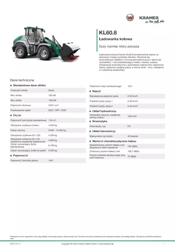 Ładowarka kołowa Kramer KL60.8 konsekwentnie stawia na pierwszym miejscu potrzeby klientów. Wyróżnia się przemyślanymi detalami i innowacjami technicznymi, takimi jak wyświetlacz 7 cali przedstawiający widok z kamery cofania, klimatyzacja automatyczna i automatyka cofania łyżki. Ergonomia kabiny zapewnia wydajną pracę, a mocny silnik - moc, niezbędną w codziennej eksploatacji.