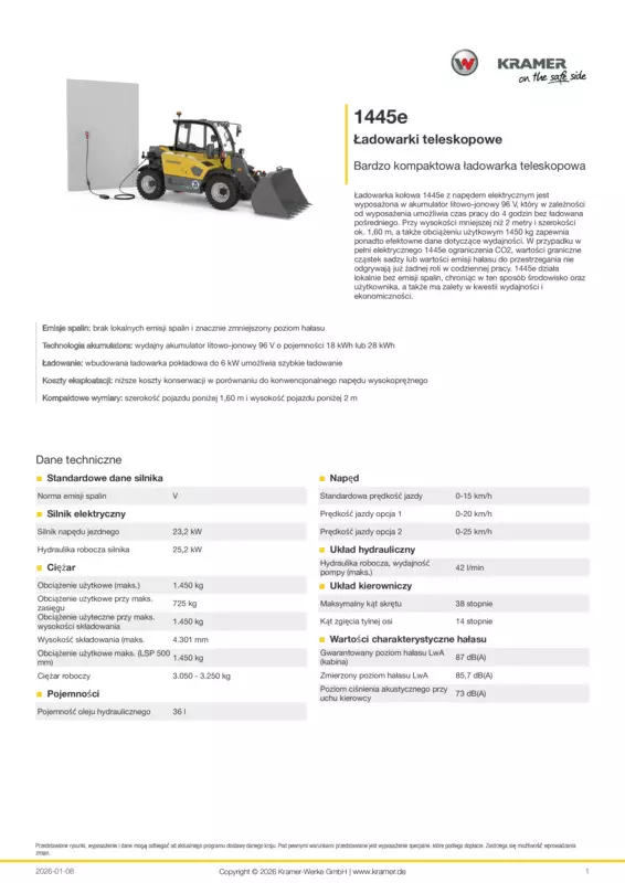 Ładowarka kołowa 1445e z napędem elektrycznym jest wyposażona w akumulator litowo-jonowy 96 V, który w zależności od wyposażenia umożliwia czas pracy do 4 godzin bez ładowana pośredniego. Przy wysokości mniejszej niż 2 metry i szerokości ok. 1,60 m, a także obciążeniu użytkowym 1450 kg zapewnia ponadto efektowne dane dotyczące wydajności. W przypadku w pełni elektrycznego 1445e ograniczenia CO2, wartości graniczne cząstek sadzy lub wartości emisji hałasu do przestrzegania nie odgrywają już żadnej roli w codziennej pracy. 1445e działa lokalnie bez emisji spalin, chroniąc w ten sposób środowisko oraz użytkownika, a także ma zalety w kwestii wydajności i ekonomiczności.