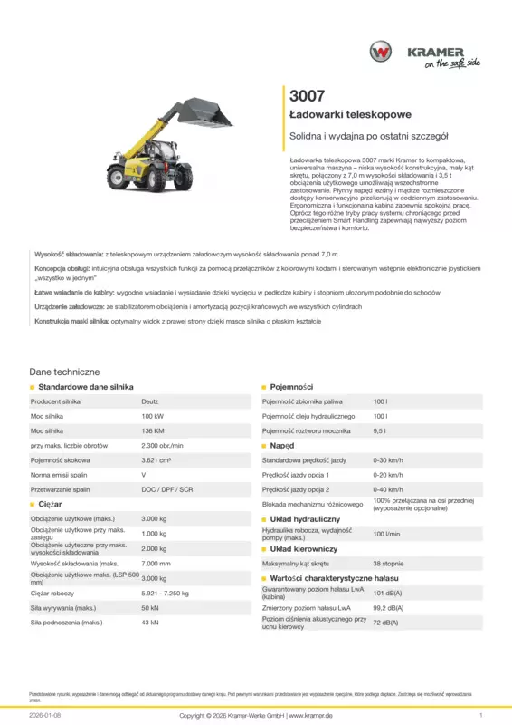 Ładowarka teleskopowa 3007 marki Kramer to kompaktowa, uniwersalna maszyna – niska wysokość konstrukcyjna, mały kąt skrętu, połączony z 7,0 m wysokości składowania i 3,5 t obciążenia użytkowego umożliwiają wszechstronne zastosowanie. Płynny napęd jezdny i mądrze rozmieszczone dostępy konserwacyjne przekonują w codziennym zastosowaniu. Ergonomiczna i funkcjonalna kabina zapewnia spokojną pracę. Oprócz tego różne tryby pracy systemu chroniącego przed przeciążeniem Smart Handling zapewniają najwyższy poziom bezpieczeństwa i komfortu.