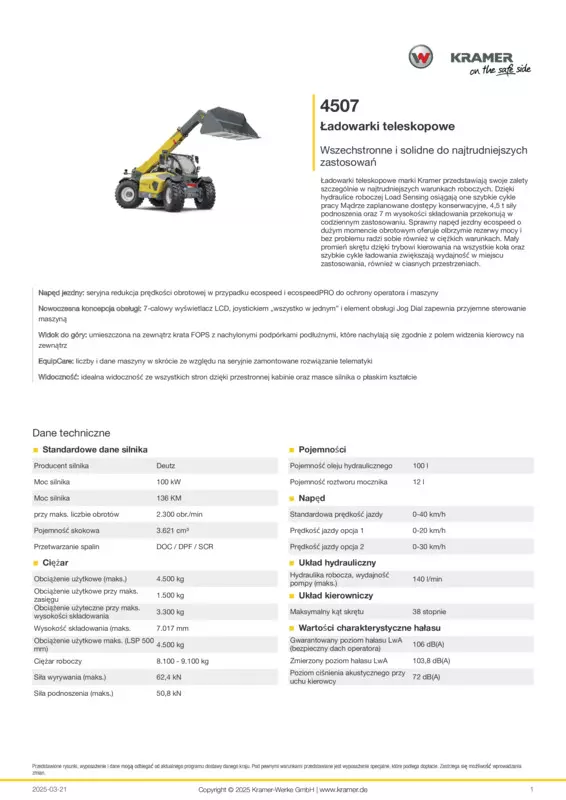 Ładowarki teleskopowe marki Kramer przedstawiają swoje zalety szczególnie w najtrudniejszych warunkach roboczych. Dzięki hydraulice roboczej Load Sensing osiągają one szybkie cykle pracy Mądrze zaplanowane dostępy konserwacyjne, 4,5 t siły podnoszenia oraz 7 m wysokości składowania przekonują w codziennym zastosowaniu. Sprawny napęd jezdny ecospeed o dużym momencie obrotowym oferuje olbrzymie rezerwy mocy i bez problemu radzi sobie również w ciężkich warunkach. Mały promień skrętu dzięki trybowi kierowania na wszystkie koła oraz szybkie cykle ładowania zwiększają wydajność w miejscu zastosowania, również w ciasnych przestrzeniach.
