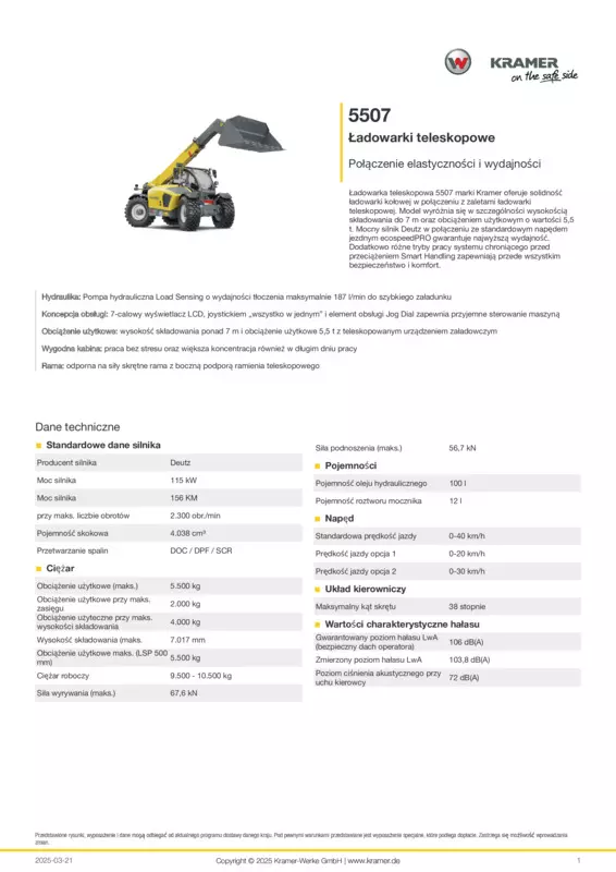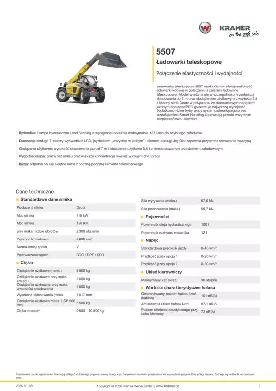 Ładowarka teleskopowa 5507 marki Kramer oferuje solidność ładowarki kołowej w połączeniu z zaletami ładowarki teleskopowej. Model wyróżnia się w szczególności wysokością składowania do 7 m oraz obciążeniem użytkowym o wartości 5,5 t. Mocny silnik Deutz w połączeniu ze standardowym napędem jezdnym ecospeedPRO gwarantuje najwyższą wydajność. Dodatkowo różne tryby pracy systemu chroniącego przed przeciążeniem Smart Handling zapewniają przede wszystkim bezpieczeństwo i komfort.