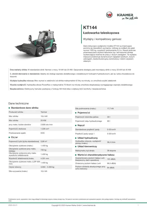 Dane dotyczące wydajności modelu KT144 są imponujące pomimo jej niewielkich wymiarów. Udźwig na widłach do palet wynosi 1450 kg, wysokość podnoszenia 4,5 m. Nawet podczas przemieszczana ciężkich ładunków (np. bel kiszonki) istnieje wystarczająca rezerwa do pracy z dużym zasięgiem. Ta wydajna maszyna przekonuje dynamicznym napędem jezdnym, dużym udźwigiem, bezkonkurencyjną zwrotnością i niskim ciężarem własnym.