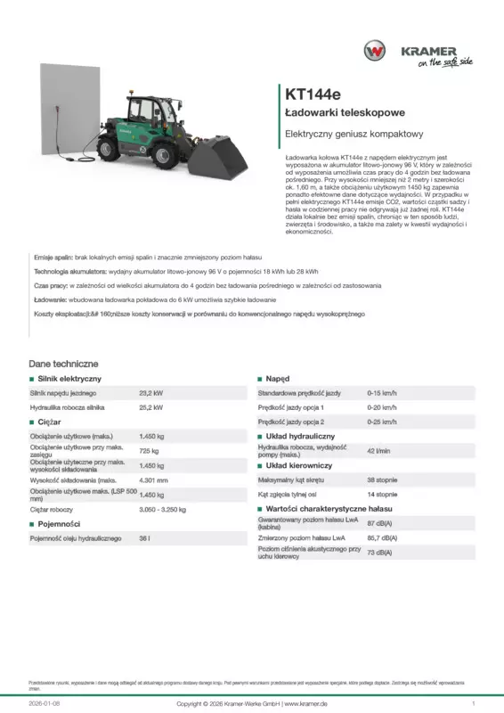 Ładowarka kołowa KT144e z napędem elektrycznym jest wyposażona w akumulator litowo-jonowy 96 V, który w zależności od wyposażenia umożliwia czas pracy do 4 godzin bez ładowana pośredniego. Przy wysokości mniejszej niż 2 metry i szerokości ok. 1,60 m, a także obciążeniu użytkowym 1450 kg zapewnia ponadto efektowne dane dotyczące wydajności. W przypadku w pełni elektrycznego KT144e emisje CO2, wartości cząstki sadzy i hasła w codziennej pracy nie odgrywają już żadnej roli. KT144e działa lokalnie bez emisji spalin, chroniąc w ten sposób ludzi, zwierzęta i środowisko, a także ma zalety w kwestii wydajności i ekonomiczności.