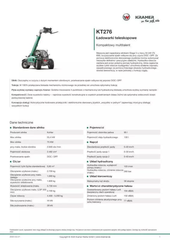 Maszyna jest napędzana silnikiem Stage V o mocy 55 kW (75 KM), oczyszczanie spalin odbywa się przy użyciu DOC i DPF. Za pomocą elektronicznie sterowanego joysticka można wykonywać niezwykle delikatne i precyzyjne załadunki. Hydraulika robocza zasilana jest przez potężną pompę hydrauliczną, która zapewnia szybkie cykle robocze wysięgnika i umożliwia działanie osprzętu zaopatrywanego za pomocą trzeciego obwodu hydraulicznego. obwód sterowniczy, w razie potrzeby z funkcją ciągłą.