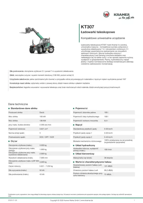 Ładowarka teleskopowa KT307 marki Kramer to zwrotna, uniwersalna maszyna – kompaktowe wymiary połączone z wysokością składowania 7 m i obciążeniem użytkowym 3 t umożliwiają wszechstronne zastosowanie we wszystkich sektorach rolniczych. Mocna hydraulika robocza z charakterystyką Load Sensing umożliwia dokładne oraz nakładające się na siebie ruchy i w ten sposób zapewnia wyższą wydajność w gospodarstwie. Płynny, hydrostatyczny napęd jezdny i mądrze rozmieszczone dostępy konserwacyjne ułatwiają codzienne zastosowanie i konserwację.