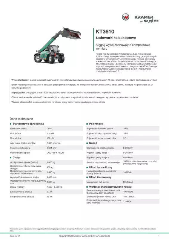 Pojazd ma długość (bez łyżki) zaledwie 5,03 m i szerokość 2,28 m. Dzięki temu pojazd ten należy do klasy „kompaktowych pojazdów uniwersalnych”, do której należy również odnoszący sukcesy model KT407. Dzięki ciężarowi roboczemu 8 200 kg (w zależności od opcji) i połączeniu kompaktowych wymiarów oraz trzyczęściowego ramienia teleskopowego model KT3610 osiąga maksymalną wysokość składowania 9,50 m i maksymalne obciążenie użytkowe 3,6 t.