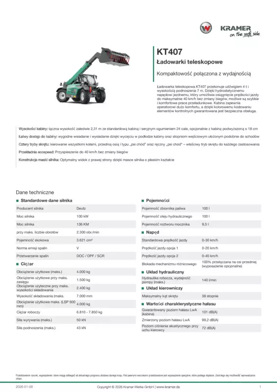 Ładowarka teleskopowa KT407 przekonuje udźwigiem 4 t i wysokością podnoszenia 7 m. Dzięki hydrostatycznemu napędowi jezdnemu, który umożliwia osiągnięcie prędkości jazdy do maksymalnie 40 km/h bez zmiany biegów, możliwe są szybkie i komfortowe prace przeładunkowe. Kabina zapewnia operatorowi dużo komfortu, a dzięki kolorowemu kodowaniu elementów kontrolnych gwarantowana jest bezpieczna obsługa.