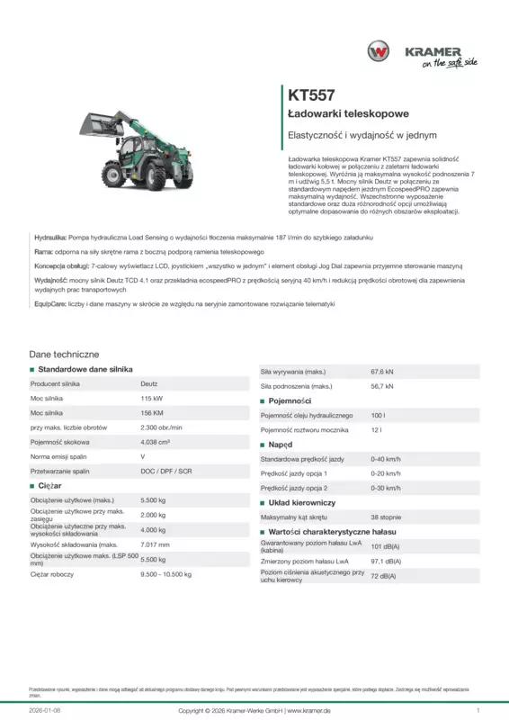 Ładowarka teleskopowa Kramer KT557 zapewnia solidność ładowarki kołowej w połączeniu z zaletami ładowarki teleskopowej. Wyróżnia ją maksymalna wysokość podnoszenia 7 m i udźwig 5,5 t. Mocny silnik Deutz w połączeniu ze standardowym napędem jezdnym EcospeedPRO zapewnia maksymalną wydajność. Wszechstronne wyposażenie standardowe oraz duża różnorodność opcji umożliwiają optymalne dopasowanie do różnych obszarów eksploatacji.