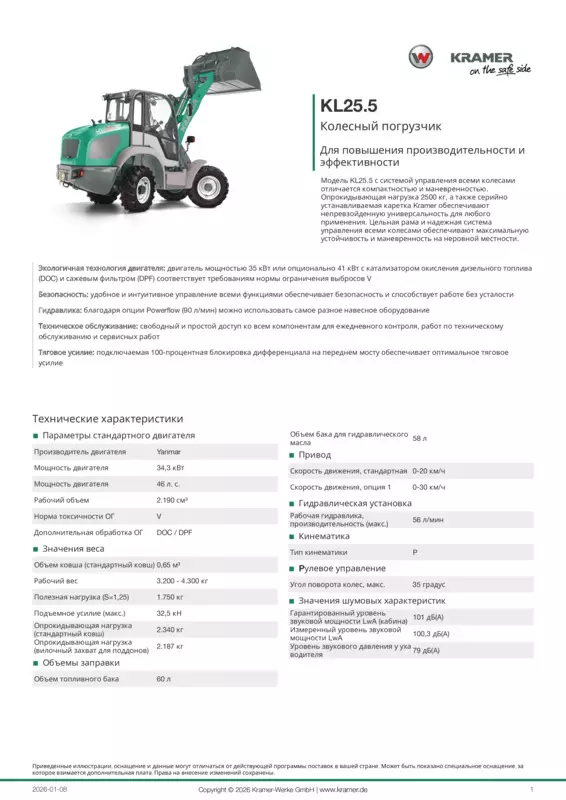 Модель KL25.5 с системой управления всеми колесами отличается компактностью и маневренностью. Опрокидывающая нагрузка 2500 кг, а также серийно устанавливаемая каретка Kramer обеспечивают непревзойденную универсальность для любого применения. Цельная рама и надежная система управления всеми колесами обеспечивают максимальную устойчивость и маневренность на неровной местности.