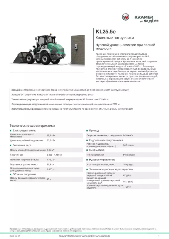 Колесный погрузчик с электроприводом KL25.5e оборудован литий-ионным аккумулятором на 96 В, который позволяет работать до 4 часов без промежуточной зарядки. Кроме того, колесный погрузчик отличается компактными размерами, а также опрокидывающей нагрузкой ковша 2800 кг. Благодаря полностью электрической модели KL25.5e выбросы CO2, частицы сажи и шум больше не играют никакой роли при ежедневной работе. Колесный погрузчик KL25.5e работает без эмиссии вредных веществ, при этом защищает людей, животных и окружающую среду, а также обеспечивает высокую эффективность и экономичность.