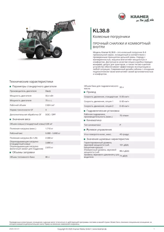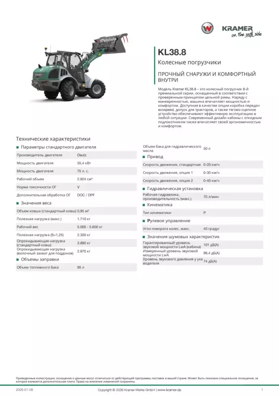 Модель Kramer KL38.8 – это колесный погрузчик 8-й премиальной серии, оснащенный в соответствии с проверенным принципом цельной рамы. Наряду с маневренностью, машина впечатляет мощностью и комфортом. Доступная в качестве опции коробка передач ecospeed, допуск для тракторов, а также тягово-сцепное устройство обеспечивают эффективную эксплуатацию в любой ситуации. Современный дизайн кабины с откидным подлокотником также впечатляет своей эргономичностью и комфортом.