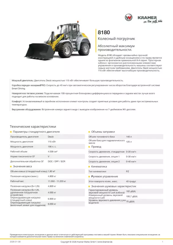 Модель 8180 обладает чрезвычайно прочной конструкцией и удобным оснащением и по праву является одним из флагманов премиальной 8-й серии. Просторная кабина с эргономично расположенными элементами управления и производительность машины соответствуют самым жестким требованиям. Двигатель Deutz мощностью 115 кВт обеспечивает высочайшую производительность.