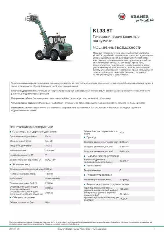 Мощный телескопический колесный погрузчик Kramer KL33.8T в серийной комплектации оснащается двигателем Deutz мощностью 55 кВт. Благодаря узкой коробчатой конструкции телескопического погрузочного устройства обеспечивается оптимальный обзор. Кроме того, телескопическое погрузочное устройство обеспечивает увеличенные рабочий диапазон, а также увеличенную высоту штабелирования и разгрузки. Кроме того, цельная рама в этой модели также обеспечивает постоянную полезную нагрузку и устойчивость.