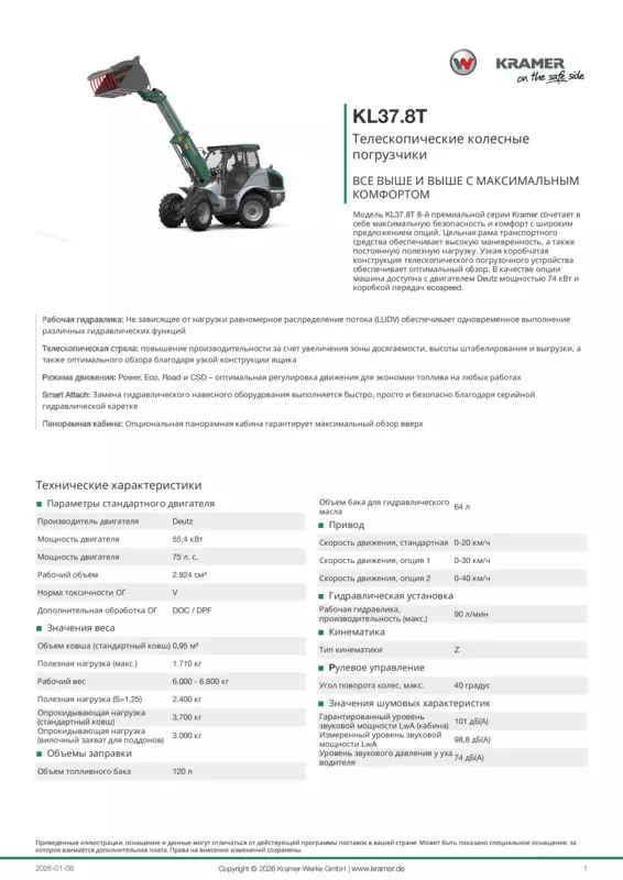 Модель KL37.8T 8-й премиальной серии Kramer сочетает в себе максимальную безопасность и комфорт с широким предложением опций. Цельная рама транспортного средства обеспечивает высокую маневренность, а также постоянную полезную нагрузку. Узкая коробчатая конструкция телескопического погрузочного устройства обеспечивает оптимальный обзор. В качестве опции машина доступна с двигателем Deutz мощностью 74 кВт и коробкой передач ecospeed.