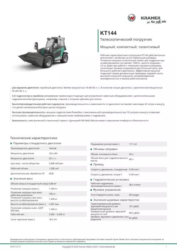 Рабочие характеристики погрузчика KT144 действительно впечатляют, несмотря на его небольшие размеры. Полезная нагрузка на вилочный захват для поддонов при штабелировании составляет 1450 кг, высота подъема – 4,5 м. Даже при работе с тяжелыми грузами (например, силосными тюками) сохраняется достаточный запас для большого рабочего диапазона. Эффективная машина подкупает своим динамичным приводом ходовой части, высокой полезной нагрузкой, непревзойденной маневренностью и малым рабочим весом.