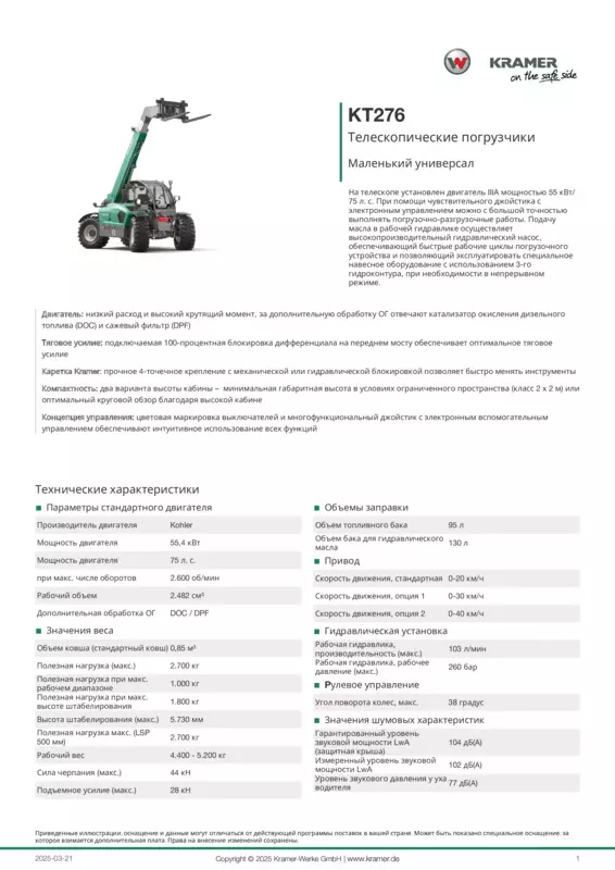 На телескопе установлен двигатель IIIA мощностью 55 кВт/75 л. с. При помощи чувствительного джойстика с электронным управлением можно с большой точностью выполнять погрузочно-разгрузочные работы. Подачу масла в рабочей гидравлике осуществляет высокопроизводительный гидравлический насос, обеспечивающий быстрые рабочие циклы погрузочного устройства и позволяющий эксплуатировать специальное навесное оборудование с использованием 3-го гидроконтура, при необходимости в непрерывном режиме.