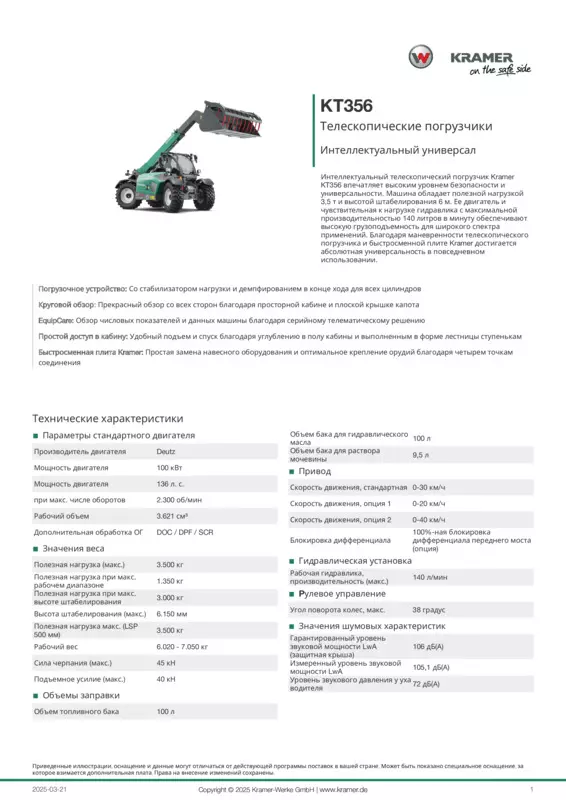 Интеллектуальный телескопический погрузчик Kramer KT356 впечатляет высоким уровнем безопасности и универсальности. Машина обладает полезной нагрузкой 3,5 т и высотой штабелирования 6 м. Ее двигатель и чувствительная к нагрузке гидравлика с максимальной производительностью 140 литров в минуту обеспечивают высокую грузоподъемность для широкого спектра применений. Благодаря маневренности телескопического погрузчика и быстросменной плите Kramer достигается абсолютная универсальность в повседневном использовании.