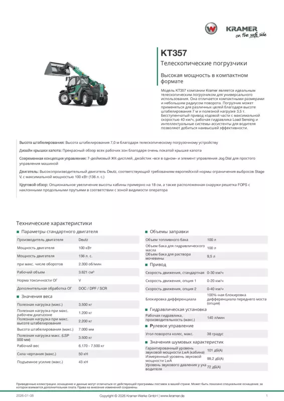 Модель KT357 компании Kramer является идеальным телескопическим погрузчиком для универсального использования. Она отличается компактными размерами и небольшим радиусом поворота. Погрузчик может применяться для различных целей благодаря высоте штабелирования 7 м и полезной нагрузке 3,5 т. Бесступенчатый привод ходовой части с максимальной скоростью 40 км/ч, рабочая гидравлика Load Sensing и интеллектуальные системы-ассистенты для водителя позволяют добиться наивысшей эффективности.