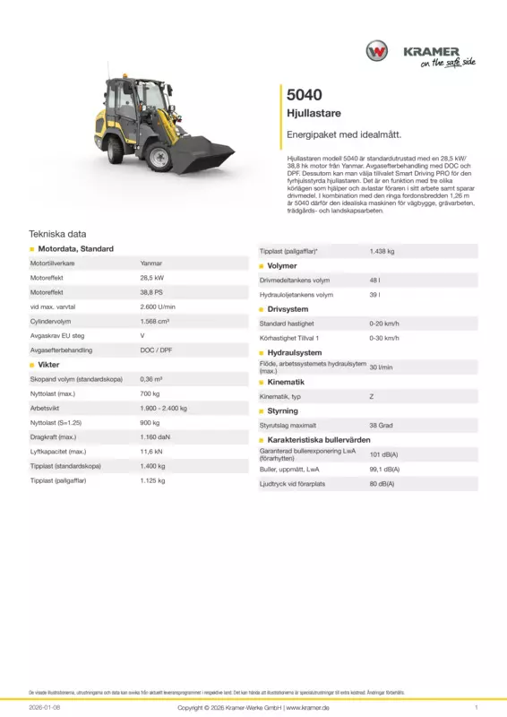Hjullastaren modell 5040 är standardutrustad med en 28,5 kW/38,8 hk motor från Yanmar. Avgasefterbehandling med DOC och DPF. Dessutom kan man välja tillvalet Smart Driving PRO för den fyrhjulsstyrda hjullastaren. Det är en funktion med tre olika körlägen som hjälper och avlastar föraren i sitt arbete samt sparar drivmedel. I kombination med den ringa fordonsbredden 1,26 m är 5040 därför den idealiska maskinen för vägbygge, grävarbeten, trädgårds- och landskapsarbeten.