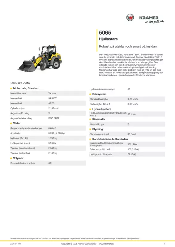Den fyrhjulsstyrda 5065, känd som ”650”, är en modell i 5-serien som är kompakt och lättmanövrerad. Skopor från 0,65 m³ till 1,1 m³ samt standardutrustad med Kramers snabbväxlingsplatta gör den till en flexibel maskin för allehanda arbetsuppgifter. Den odelade ramen och den beprövade fyrhjulsstyrningen ger maximal stabilitet och manövreringsförmåga i svår terräng. Maskinen har inga som helst problem med att lyfta en pall med sten, vilket är en fördel vid gatuarbeten, trädgårdsanläggning och landskapsarbeten – anmärkningsvärt för denna viktklass.