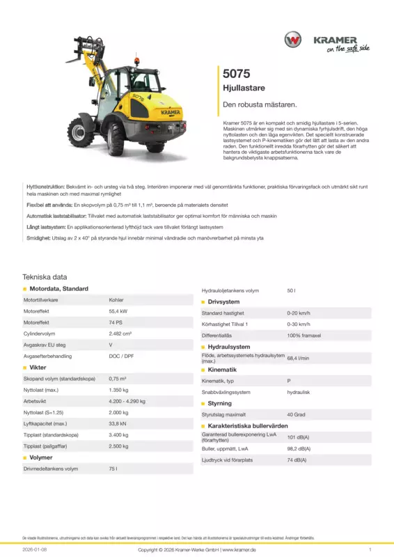 Kramer 5075 är en kompakt och smidig hjullastare i 5-serien. Maskinen utmärker sig med sin dynamiska fyrhjulsdrift, den höga nyttolasten och den låga egenvikten. Det speciellt konstruerade lastsystemet och P-kinematiken gör det lätt att lasta av den andra raden. Den funktionellt inredda förarhytten gör det säkert att hantera de viktigaste arbetsfunktionerna tack vare de bakgrundsbelysta knappsatserna.