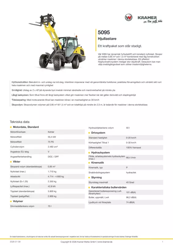 Vår 5095 har dynamisk fyrhjulsdrift och konstant nyttolast. Skopor på mellan 0,95 m³ och 1,5 m³ kombinerat med låg konstruktion utmärker maskiner i denna storleksklass. Ett effektivt högtrycksdrivsystem medger stor skjutkraft. Dessutom kan man välja snabbgångsväxel som utökar insatsmöjligheterna.