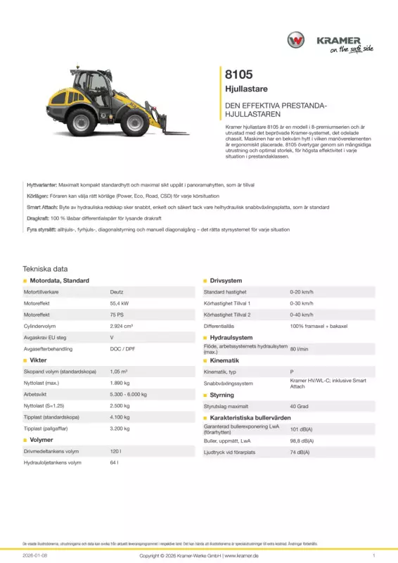Kramer hjullastare 8105 är en modell i 8-premiumserien och är utrustad med det beprövade Kramer-systemet, det odelade chassit. Maskinen har en bekväm hytt i vilken manöverelementen är ergonomiskt placerade. 8105 övertygar genom sin mångsidiga utrustning och optimal storlek, för högsta effektivitet i varje situation i prestandaklassen.
