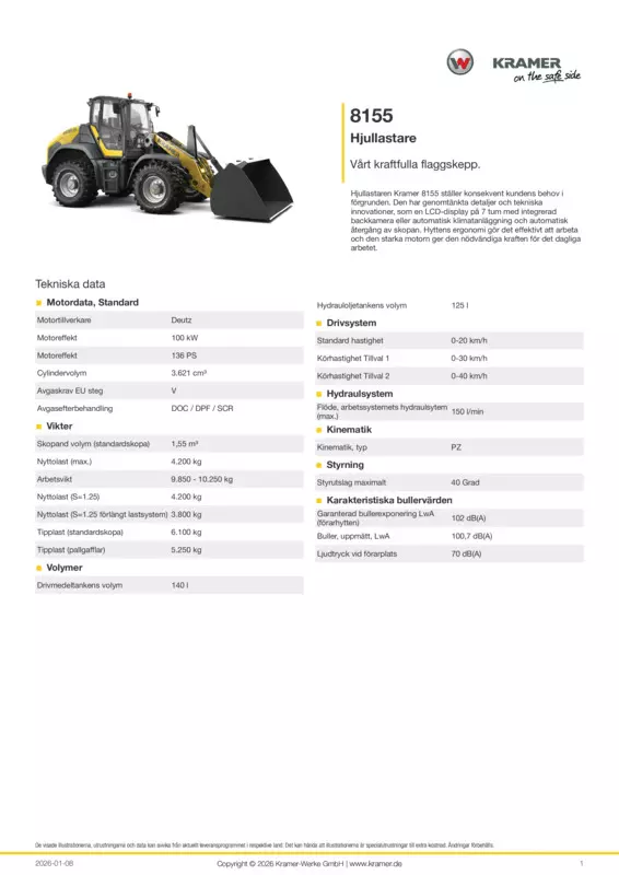Hjullastaren Kramer 8155 ställer konsekvent kundens behov i förgrunden. Den har genomtänkta detaljer och tekniska innovationer, som en LCD-display på 7 tum med integrerad backkamera eller automatisk klimatanläggning och automatisk återgång av skopan. Hyttens ergonomi gör det effektivt att arbeta och den starka motorn ger den nödvändiga kraften för det dagliga arbetet.