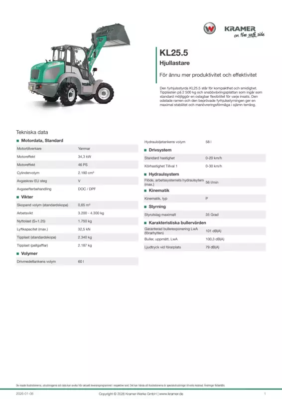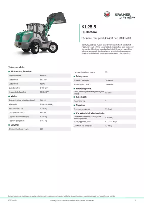 Den fyrhjulsstyrda KL25.5 står för kompakthet och smidighet. Tipplasten på 2 500 kg och snabbväxlingsplattan som ingår som standard möjliggör en oslagbar flexibilitet för varje insats. Den odelade ramen och den beprövade fyrhjulsstyrningen ger en maximal stabilitet och manövreringsförmåga i ojämn terräng.