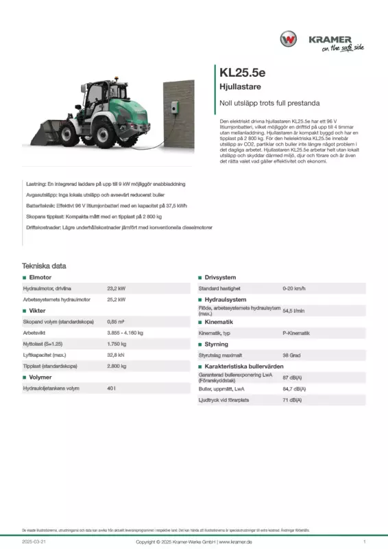 Den elektriskt drivna hjullastaren KL25.5e har ett 96 V litiumjonbatteri, vilket möjliggör en drifttid på upp till 4 timmar utan mellanladdning. Hjullastaren är kompakt byggd och har en tipplast på 2 800 kg. För den helelektriska KL25.5e innebär utsläpp av CO2, partiklar och buller inte längre något problem i det dagliga arbetet. Hjullastaren KL25.5e arbetar helt utan lokalt utsläpp och skyddar därmed miljö, djur och förare och är även det rätta valet vad gäller effektivitet och ekonomi.
