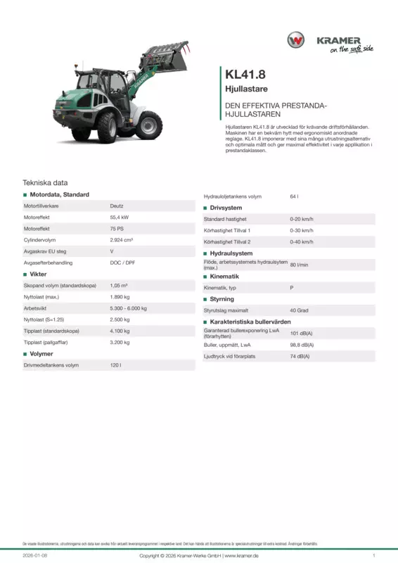 Hjullastaren KL41.8 är utvecklad för krävande driftsförhållanden. Maskinen har en bekväm hytt med ergonomiskt anordnade reglage. KL41.8 imponerar med sina många utrustningsalternativ och optimala mått och ger maximal effektivitet i varje applikation i prestandaklassen.