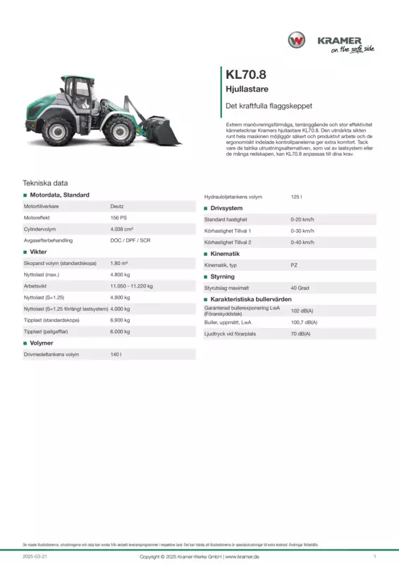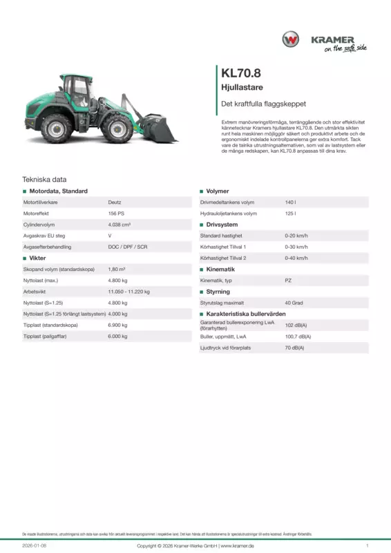 Extrem manövreringsförmåga, terränggående och stor effektivitet kännetecknar Kramers hjullastare KL70.8. Den utmärkta sikten runt hela maskinen möjliggör säkert och produktivt arbete och de ergonomiskt indelade kontrollpanelerna ger extra komfort. Tack vare de talrika utrustningsalternativen, som val av lastsystem eller de många redskapen, kan KL70.8 anpassas till dina krav.