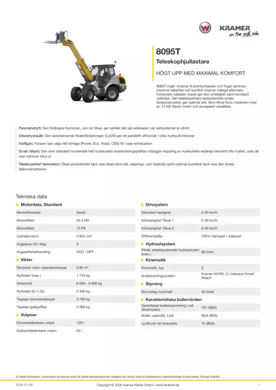 8095T ingår i Kramer 8-premiumserien och fogar samman maximal säkerhet och komfort med en mängd alternativ. Fordonets odelade chassi ger stor smidighet samt konstant nyttolast. Det teleskoperbara lastsystemets smala boxkonstruktion ger optimal sikt. Som tillval finns maskinen med en 74 kW Deutz-motor och ecospeed-växellåda.